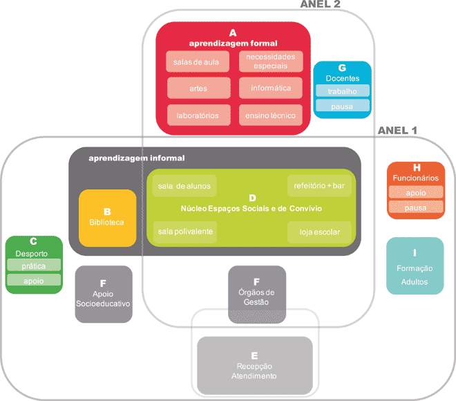 Neste modelo concetual é reforçada a existência de um núcleo de aprendizagem formal, estruturado em níveis correspondentes às grandes áreas do saber, que dialoga com o núcleo de aprendizagem informal. Reconhecendo o papel da escola na dinâmica urbana onde se insere, o núcleo de serviços passíveis de se abrirem à comunidade é pensado de forma estratégica criando um setor que deve exibir forte condição de centralidade e, ao mesmo tempo, de possível destaque nos períodos fora da atividade escolar, física e simbólica.